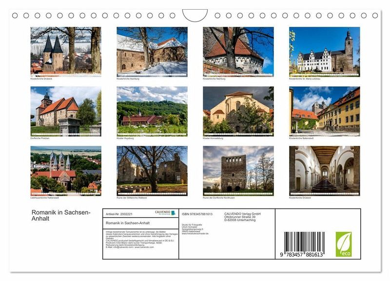 Die Straße der Romanik verläuft in einer Süd- und Nordroute durch Sachsen-Anhalt. In stimmungsvollen Bildern werden in diesem Kalender einige der vielen romanischen Bauten gezeigt. Dem Fotografen ist es gelungen, zu unterschiedlichen Jahreszeiten neue und einzigartige Sichtweisen auf die Bauwerke festzuhalten.