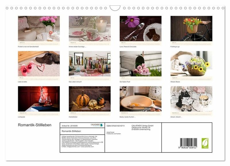 QUALITÄT - Hochwertiger Fotokalender mit 12 wunderschönen Motiven auf lichtbeständigem Bilderdruckpapier, robuste Spiralbindung mit Aufhängebügel.NACHHALTIG - deutliche Abfallreduzierung durch bedarfsgerechte Einzelstückfertigung, umweltfreundliches FSC-zertifiziertes Papier, Produktion in Deutschland, klimabewusste Logistik.PERFEKTES GESCHENK - Kalender für Freunde und Familie, für Kinder und Erwachsene, jung und alt, zu Weihnachten, Geburtstag oder zwischendurch.VIELFALT - Bildkalender in verschiedenen Formaten, z.B. DIN A5, DIN A4, DIN A3 sowie DIN A2. Ob Naturmotiv, Gemälde oder Fotos, ideal für ein persönliches Wohlfühlambiente.Eine Auswahl romantischer Stillleben von Autor(in): Antje Buder