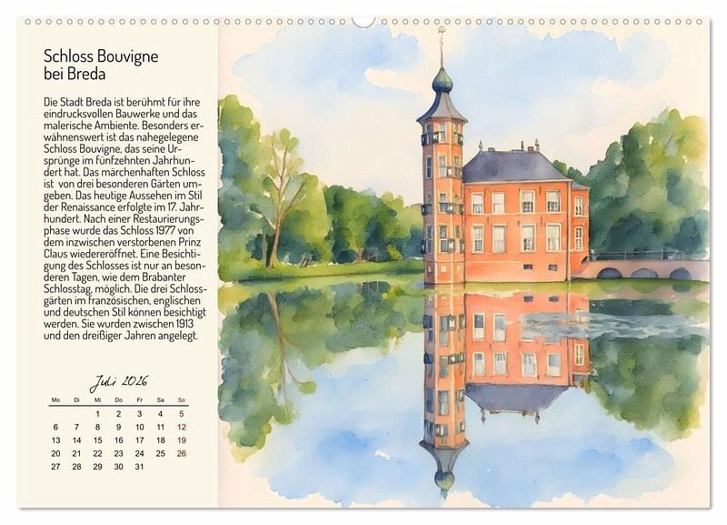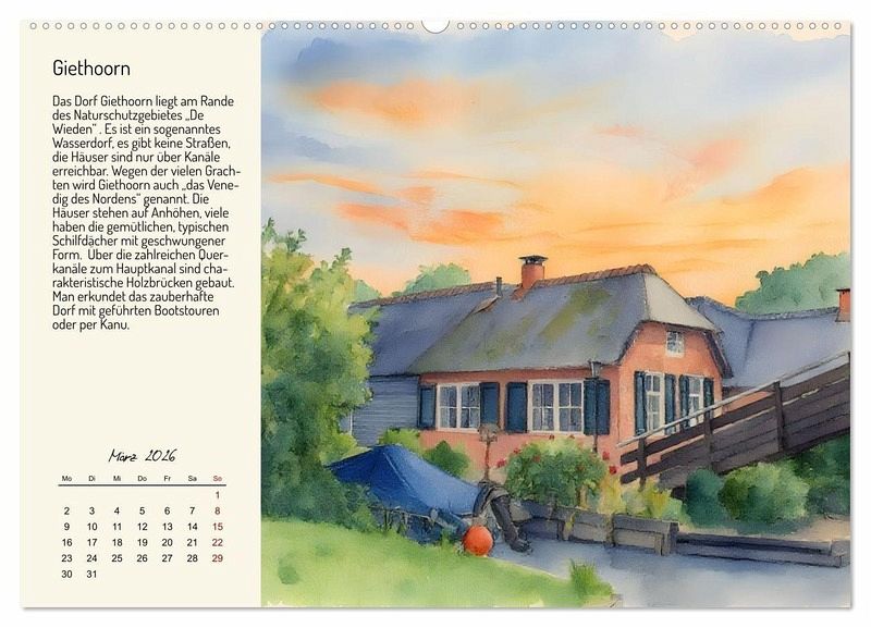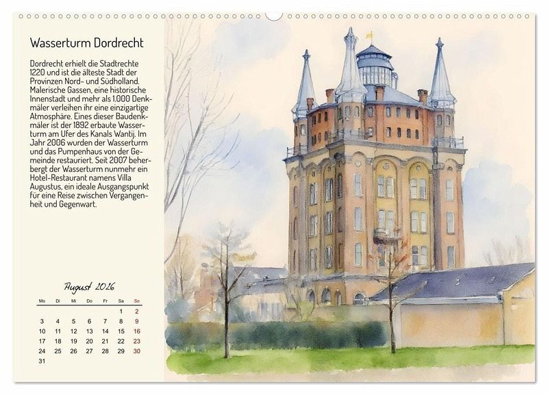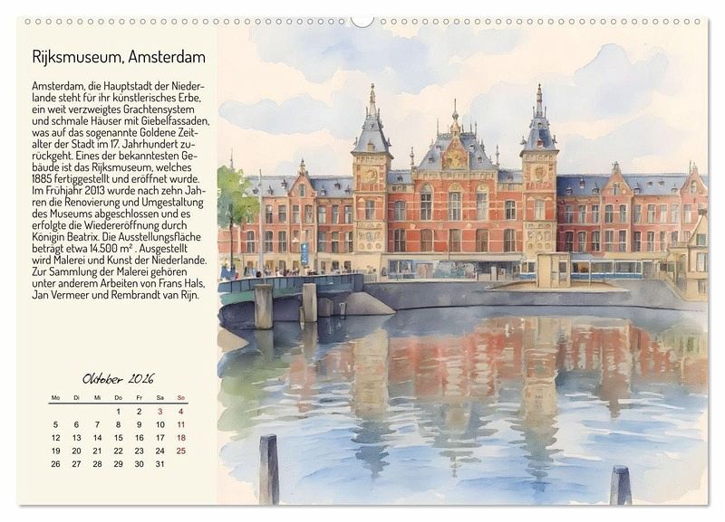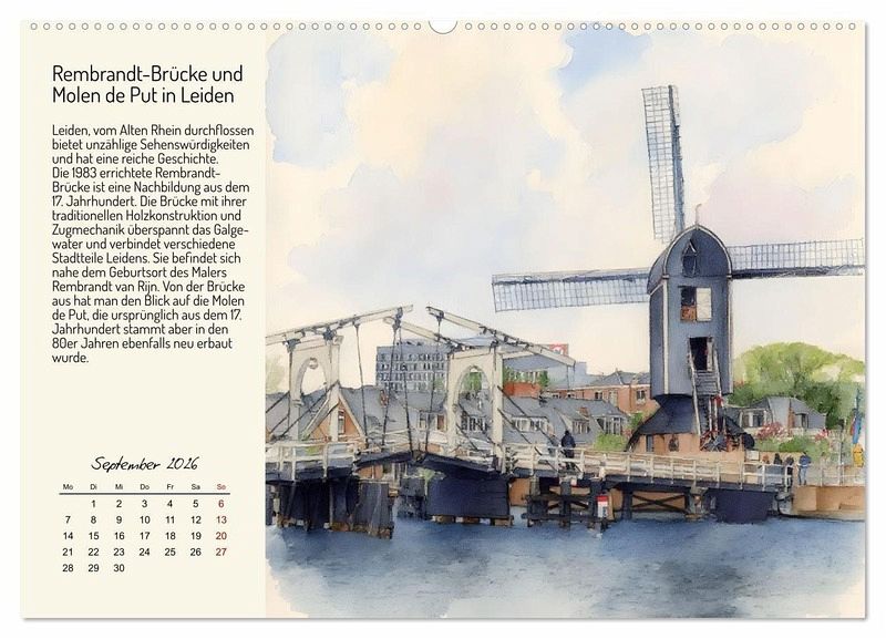 Die Niederlande sind ein kleines, aber vielseitiges Land im Westen Europas, bekannt für seine flache Landschaft, historischen Städte, Grachtenkanäle und eine reiche Kunst- und Handelsgeschichte. Überall findet man zauberhafte historische Bauwerke, sei es Gotteshäuser, Schlösser, Museen oder einfache Bürgerhäuser. Der besondere Charme entsteht durch die unzähligen Grachten von denen die Orte durchzogen sind. Lassen Sie sich durch die zauberhaften Bilder im Aquarell-Stil inspirieren, die durch moderne Bildbearbeitung aus Fotos entstanden sind und besuchen die Niederlande.