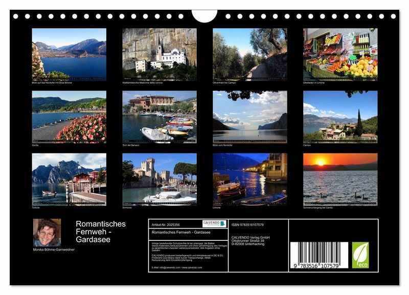 Die malerischen Ortschaften Limone, Garda und Sirmione, der Strand von Torbole, der Hafen von Torri del Benaco und viele weitere idyllische Orte wecken Reisesehnsucht und laden zum Träumen ein, stimmungsvoll eingefangen und präsentiert von Monika Böhme-Garnweidner