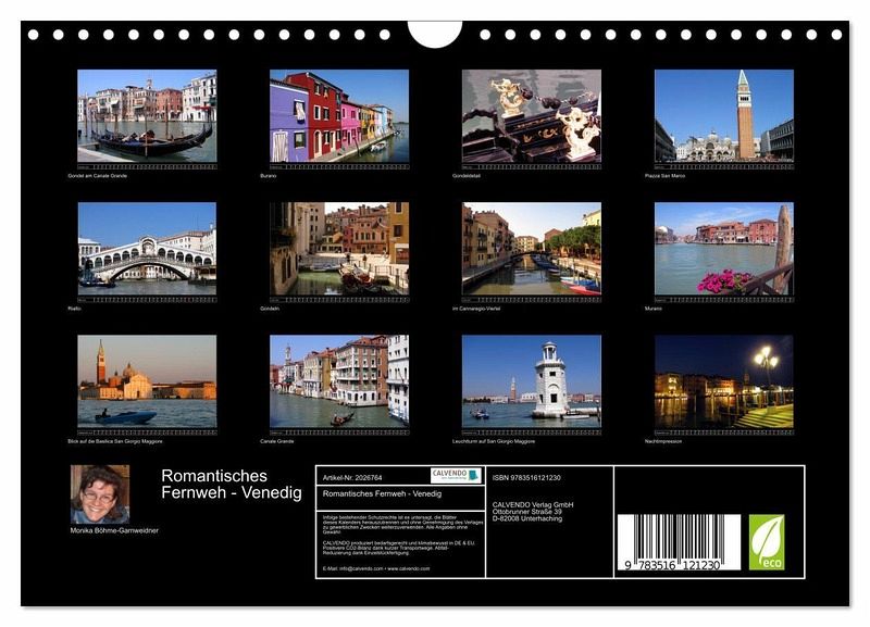 Stimmungsvolle Impressionen und Farbenspiele aus der wunderschönen Lagunenstadt Venedig sowie von den nahegelegenen Inseln Murano und Burano wecken Reisesehnsucht und laden zum Träumen ein. Ein farbenfroher Wandkalender, nicht nur für Venedigbegeisterte!