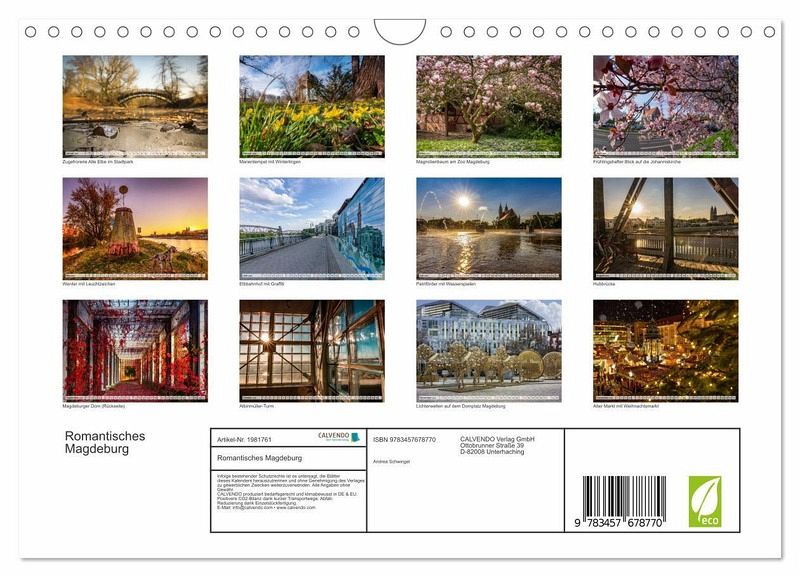 QUALITÄT - Hochwertiger Fotokalender mit 12 wunderschönen Motiven auf lichtbeständigem Bilderdruckpapier, robuste Spiralbindung mit Aufhängebügel.NACHHALTIG - deutliche Abfallreduzierung durch bedarfsgerechte Einzelstückfertigung, umweltfreundliches FSC-zertifiziertes Papier, Produktion in Deutschland, klimabewusste Logistik.PERFEKTES GESCHENK - Kalender für Freunde und Familie, für Kinder und Erwachsene, jung und alt, zu Weihnachten, Geburtstag oder zwischendurch.VIELFALT - Bildkalender in verschiedenen Formaten, z.B. DIN A5, DIN A4, DIN A3 sowie DIN A2. Ob Naturmotiv, Gemälde oder Fotos, ideal für ein persönliches Wohlfühlambiente.Magdeburg von seiner romantischen Seite von Autor(in): Andrea Schwingel