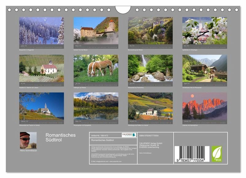 Kaum eine ander Region in Europa, kann Sehnsüchte nach Erhohlung und Romantik erfüllen, als das Land der Burgen und Weingärten im Süden der Alpen. Perfekt fotografierte Orte und Landschaften aus Südtirol zeigt dieser Kalender von Heinz Schmidbauer.