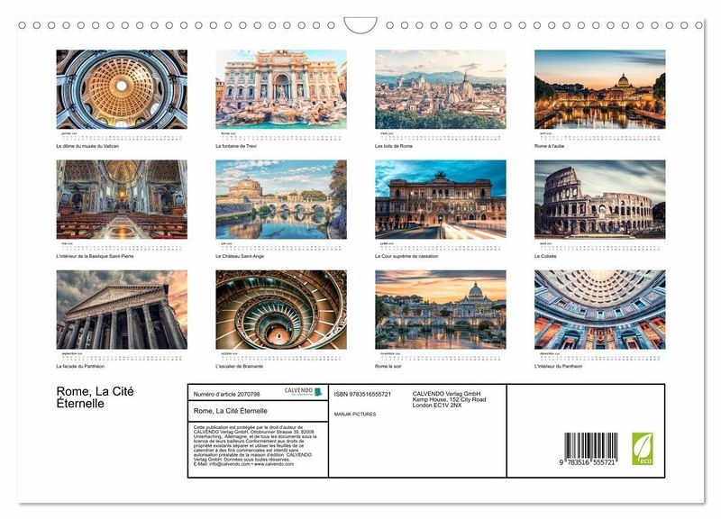 La capitale italienne s'impose comme le coeur historique et culturel de l'Italie. Rome est devenue l'un des foyers de la Renaissance italienne, avec Florence et Venise, et a donné naissance au style baroque.Découvrez les plus beaux monuments de la ville dans ce superbe calendrier.