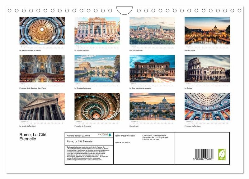 La capitale italienne s'impose comme le coeur historique et culturel de l'Italie. Rome est devenue l'un des foyers de la Renaissance italienne, avec Florence et Venise, et a donné naissance au style baroque.Découvrez les plus beaux monuments de la ville dans ce superbe calendrier.