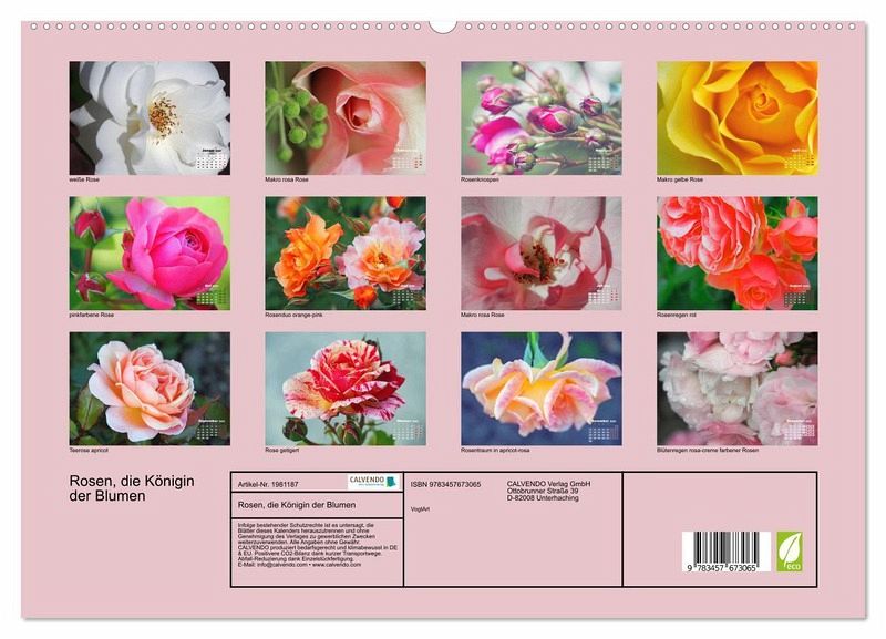 Dieser Kalender ist der ideale Wandschmuck für alle Rosenliebhaber mit 12 kunstvoll arrangierten Fotografien. Die Fotografien wurden in verschieden Parkanlagen, wie der Insel Mainau, Kurpark Bad Wörishofen, etc. aufgenommen. Mit diesem Kalender ist das Blühen der Rosen unvergänglich! Auch als Geschenk eignet sich dieser wunderschöne Kalender hervorragend. In jedem meiner Kalender steckt meine Liebe zur Natur, zum Detail und zu Farbkompositionen.