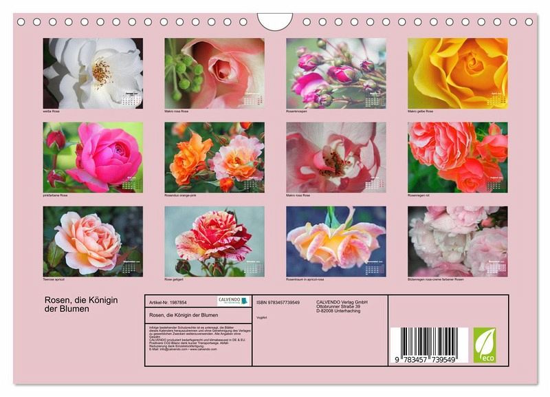 Dieser Kalender ist der ideale Wandschmuck für alle Rosenliebhaber mit 12 kunstvoll arrangierten Fotografien. Die Fotografien wurden in verschieden Parkanlagen, wie der Insel Mainau, Kurpark Bad Wörishofen, etc. aufgenommen. Mit diesem Kalender ist das Blühen der Rosen unvergänglich! Auch als Geschenk eignet sich dieser wunderschöne Kalender hervorragend. In jedem meiner Kalender steckt meine Liebe zur Natur, zum Detail und zu Farbkompositionen.