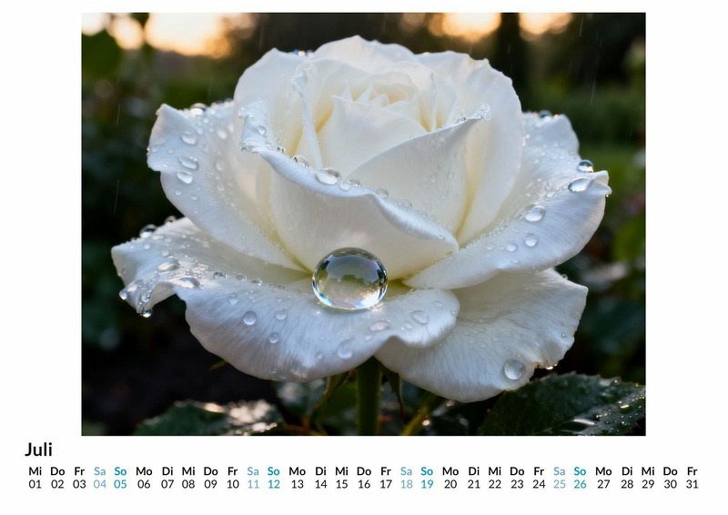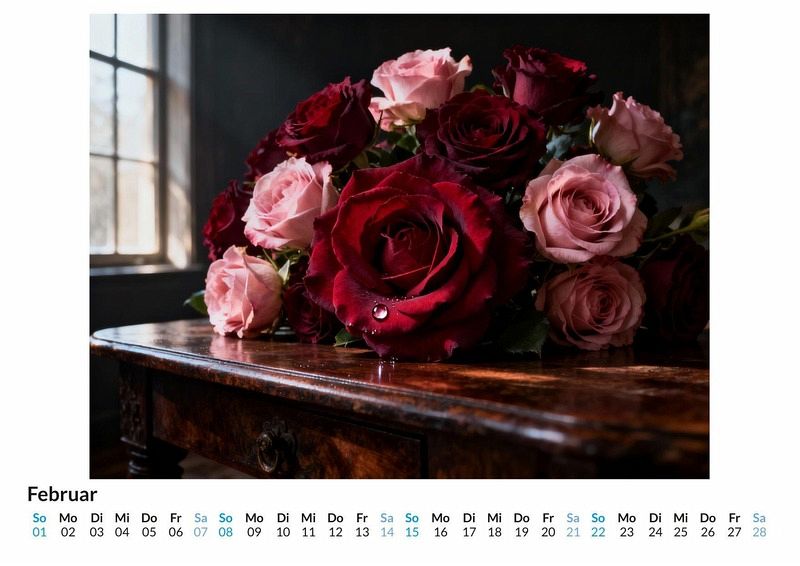 Seit Jahrhunderten wird sie als die unangefochtene Königin der Blumen verehrt. Ihre Vielfalt an Farben und Formen inspiriert seit jeher. Der Kalender "Rosen in voller Blüte" widmet sich dieser Faszination mit zwölf außergewöhnlichen Darstellungen, die die Pracht der Rose in den Mittelpunkt stellen und ihre Schönheit auf eine neue Art interpretieren. Dieser Kalender ist eine ideale Wahl: * Für Liebhaber der floralen Ästhetik und Gartenfreunde. * Für Menschen mit einem Sinn für detailreiche und farbintensive Kompositionen. * Für alle, die einen stilvollen Wandschmuck für das ganze Jahr suchen. Jedes Monatsblatt enthüllt eine neue Facette der Rose. Von der zarten Knospe, die sich dem Licht entgegenstreckt, bis zur opulenten Blüte in voller Pracht. Die Bilder zeigen die feinen Adern der Blütenblätter, den Glanz von Tautropfen und das Spiel von Licht und Schatten. Diese Motive wurden durch das Zusammenspiel von menschlicher Vision und der Rechenleistung moderner Algorithmen erschaffen, um eine besondere Perspektive auf die bekannte Schönheit der Rose zu eröffnen. Was Sie mit diesem Kalender erhalten: * Zwölf sorgfältig ausgewählte Rosenmotive, eines für jeden Monat. * Ein klares und gut lesbares Kalendarium unter jedem Bild. * Ein dekorativer Begleiter, der das ganze Jahr über Freude bereitet. Dieser Kalender ist eine Hommage an die zeitlose Eleganz der Rose. Jedes Bild lädt dazu ein, die feinen Details und die Farbenpracht der Natur neu zu entdecken. Erleben Sie, wie die Königin der Blumen Monat für Monat in einem anderen Licht erstrahlt. Eine Vorschau der einzelnen Monatsblätter gibt einen Einblick in die Vielfalt der Motive.