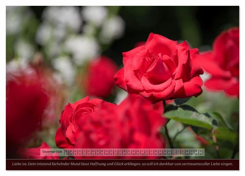 Edle Rosen begleitet von liebevoller Poesie in wunderschönen Bildern. Die Aufnahmen der Rosen entstanden im Freien, die Blüten verschmelzen im Sonnenlicht duftig zart mit der Natur in den Hintergründen. Der Kalender gibt einen Eindruck von verschiedenen Rosensorten wieder, die auf der Rückseite benannt werden.