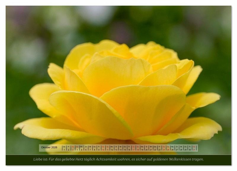 Edle Rosen begleitet von liebevoller Poesie in wunderschönen Bildern. Die Aufnahmen der Rosen entstanden im Freien, die Blüten verschmelzen im Sonnenlicht duftig zart mit der Natur in den Hintergründen. Der Kalender gibt einen Eindruck von verschiedenen Rosensorten wieder, die auf der Rückseite benannt werden.