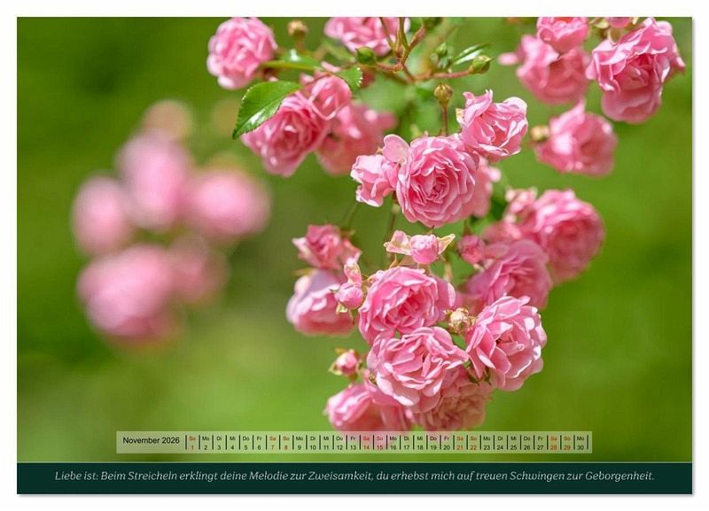Edle Rosen begleitet von liebevoller Poesie in wunderschönen Bildern. Die Aufnahmen der Rosen entstanden im Freien, die Blüten verschmelzen im Sonnenlicht duftig zart mit der Natur in den Hintergründen. Der Kalender gibt einen Eindruck von verschiedenen Rosensorten wieder, die auf der Rückseite benannt werden.