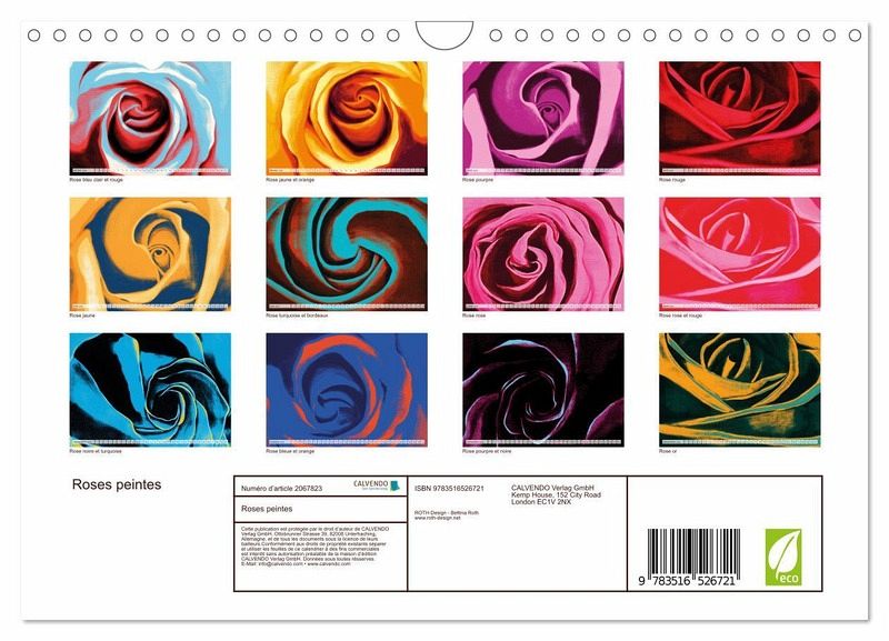 La rose, reine de toutes les fleurs, est un motif intemporel et attrayant pour tous, jeunes et moins jeunes. C'est pourquoi ce calendrier, avec ses roses peintes dans différentes combinaisons de couleurs, convient parfaitement comme cadeau, comme décoration murale chez vous ou sur votre lieu de travail. Les couleurs et le caractère abstrait des pétales de roses rendent ce calendrier unique en son genre. Nous vous souhaitons beaucoup de plaisir avec ce magnifique calendrie.