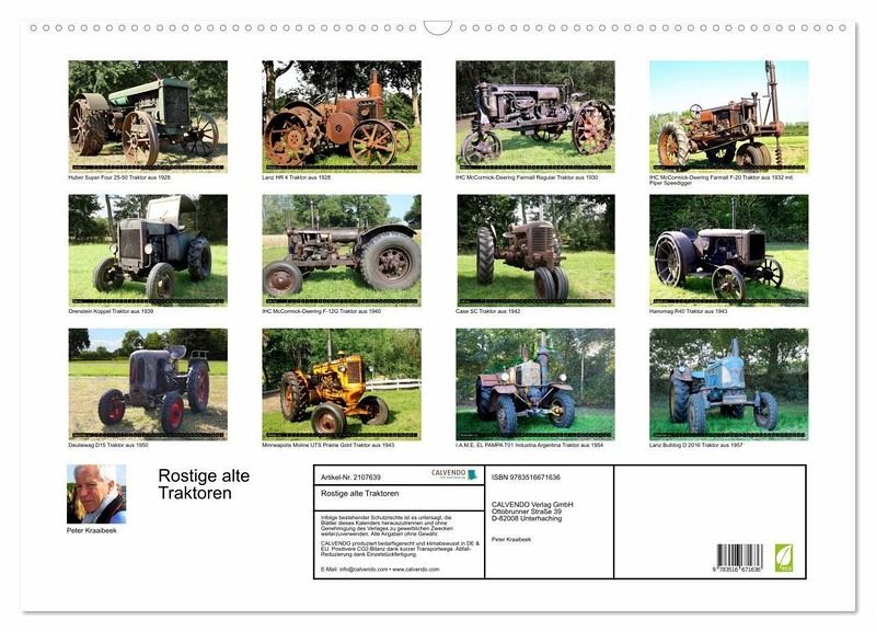 Rost erzählt Geschichten - und kein Traktor gleicht dem anderen. Dieser Kalender zeigt in eindrucksvollen Fotografien rostige Oldtimer-Traktoren aus den Jahren 1928 bis 1957. Maschinen, die einst die Landwirtschaft prägten, stehen heute als faszinierende Zeitzeugen mit unverwechselbarem Charme da. Das Zusammenspiel von Patina, verwittertem Metall und klassischem Design macht diese historischen Landmaschinen zu wahren Kunstwerken. Jeder Monat offenbart ein Stück bäuerliche Geschichte und weckt nostalgische Erinnerungen an vergangene Zeiten. Ideal für Traktorfreunde, Oldtimer-Liebhaber, Sammler und alle, die sich für die Geschichte der Landwirtschaft begeistern.