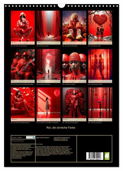 Rot, die Farbe der Liebe. Es ist die Farbe, mit der die meisten Menschen viele erhebliche Dinge assoziieren: Kraft, Feuer, Leidenschaft, Liebe, Eifersucht, Energie. Wenn Sie die Farbe Rot mögen, dann sollten Sie sich diesen Kalender nicht entgehen lassen. Erleben Sie selbst, wie diese Bilder Sie anregen, Ihren Körper, Geist und Ihre Seele beleben. Der Fotokünstler Peter Roder hat dazu fantastische KI-Bilder gestaltet. Begeistern Sie sich an diesen einmaligen Bilden.