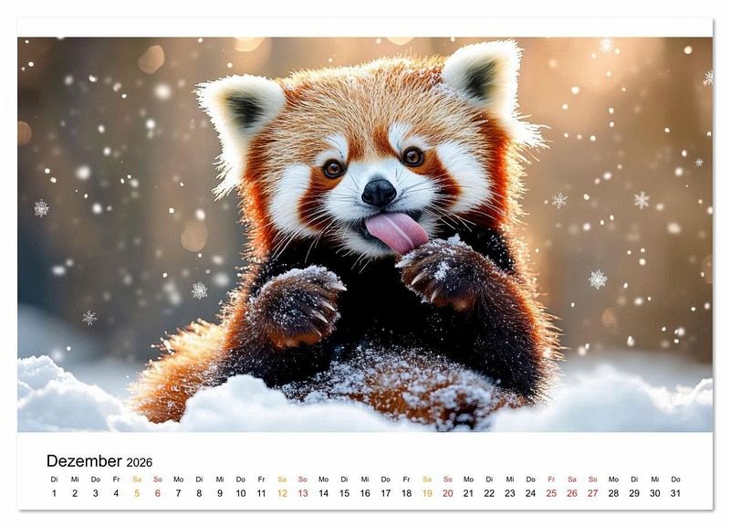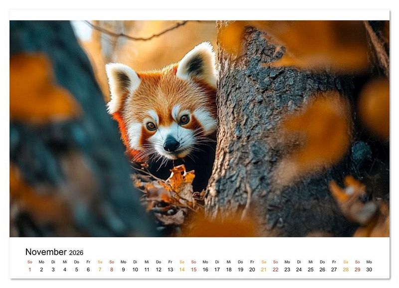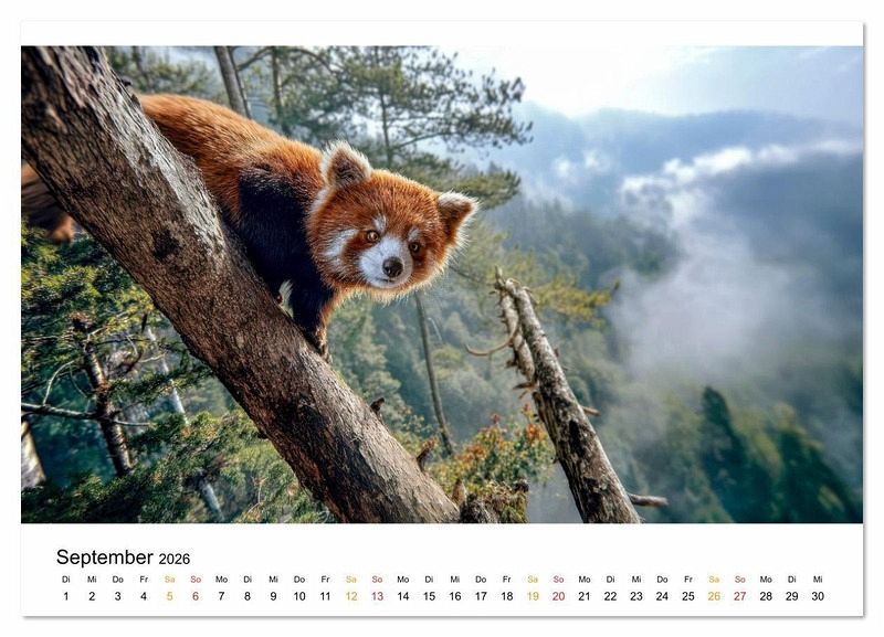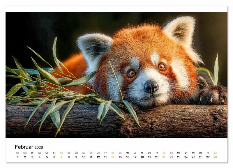 Lassen Sie sich verzaubern von zwölf berührenden Bildern voller Anmut, Flauschigkeit und natürlicher Schönheit. Erleben Sie diese immer wieder bezaubernden Kleinen Pandas - vom Aussterben bedroht - mal neugierig blickend, mal verträumt. Als scheue Einzelgänger bewegen sie sich durch ihre grüne Welt mit leiser Eleganz. Und wenn Nachwuchs dabei ist, umgibt sie zärtliche Fürsorge. Jedes dieser wunderbarer KI-Bilder erzählt eine leise Geschichte von Freiheit, Ursprünglichkeit und dem Zauber der Roten Pandas. Ein Kalender für Naturliebhaber, Tierfreunde und alle, die sich nach einem Stück Wildnis im Alltag sehnen.