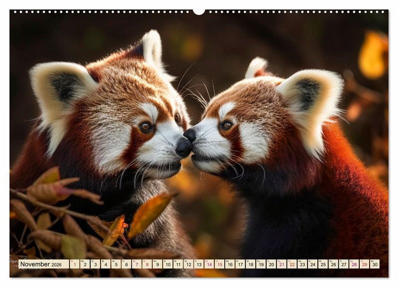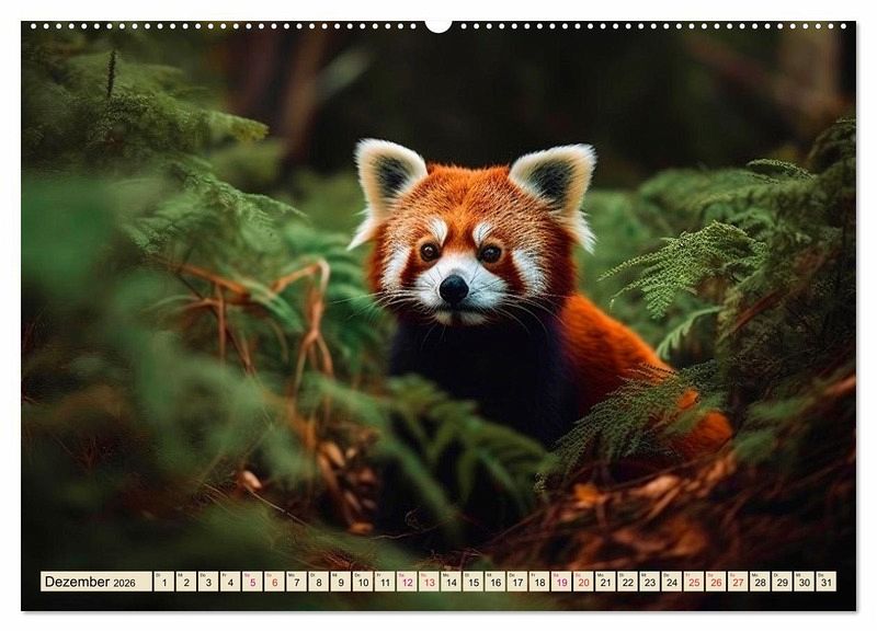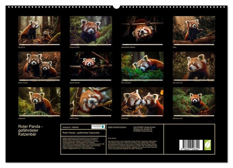 Der kleine Panda, auch Katzenbär, Roter Panda, Feuerfuchs, Bärenkatze oder Goldhund genannt, steht auf der Roten Liste gefährdeter Tierarten der Weltnaturschutzunion und ist noch im Gebiet zwischen Nepal, Burma, Südchina bis zum östlichen Zentralchina zu finden. Der Fotokünstler Peter Roder hat wunderschöne KI-Bilder gestaltet. Ein eindrucksvoller Kalender und ein bezaubernder Begleiter für jeden Tierfreund.