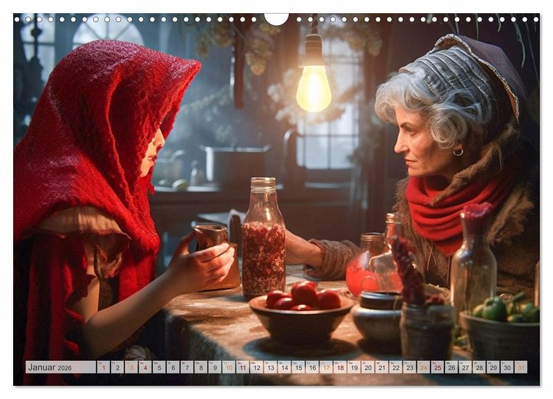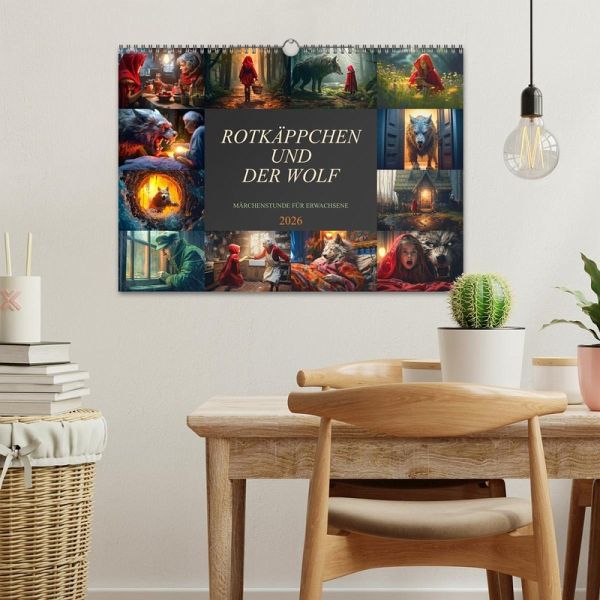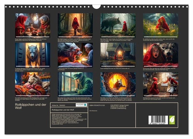 Entdecke die zauberhafte Welt von Rotkäppchen - jetzt als Wandkalender erhältlich! Begib dich auf eine Reise in den märchenhaften Wald und lass dich von der zeitlosen Geschichte von Rotkäppchen verzaubern. Unser exquisiter Wandkalender bringt dir Monat für Monat die faszinierende Welt dieses beliebten Märchens näher. Der Rotkäppchen-Wandkalender ist mit hochwertigem Papier und einer stabilen Spiralbindung versehen, sodass du jeden Monat aufs Neue Freude daran haben wirst.Überrasche einen geliebten Menschen mit diesem bezaubernden Wandkalender. Ob als Geburtstags-, Weihnachts- oder einfach als Überraschungsgeschenk zwischendurch - dieser Kalender wird garantiert für strahlende Augen sorgen. Oder gönne dir selbst etwas Besonderes und lass den Alltag hinter dir, während du die märchenhafte Atmosphäre von Rotkäppchen genießt.Tauche ein in die Welt der Märchen und hol dir jetzt deinen Rotkäppchen-Wandkalender! Ein zeitloses Geschenk voller Magie und Inspiration für dich oder deine Liebsten. Die Bilder wurden im Übrigen vom Fotografen und Digiartkünstler Dirk Meutzner, mit KI und Photoshop erstellt.