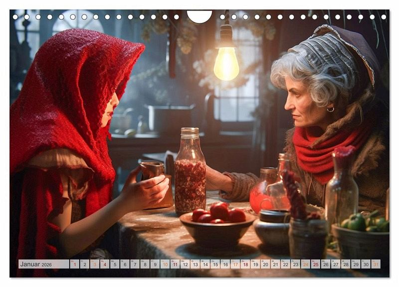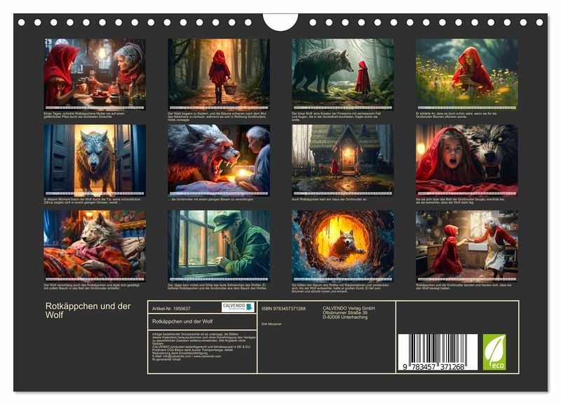 Entdecke die zauberhafte Welt von Rotkäppchen - jetzt als Wandkalender erhältlich! Begib dich auf eine Reise in den märchenhaften Wald und lass dich von der zeitlosen Geschichte von Rotkäppchen verzaubern. Unser exquisiter Wandkalender bringt dir Monat für Monat die faszinierende Welt dieses beliebten Märchens näher. Der Rotkäppchen-Wandkalender ist mit hochwertigem Papier und einer stabilen Spiralbindung versehen, sodass du jeden Monat aufs Neue Freude daran haben wirst.Überrasche einen geliebten Menschen mit diesem bezaubernden Wandkalender. Ob als Geburtstags-, Weihnachts- oder einfach als Überraschungsgeschenk zwischendurch - dieser Kalender wird garantiert für strahlende Augen sorgen. Oder gönne dir selbst etwas Besonderes und lass den Alltag hinter dir, während du die märchenhafte Atmosphäre von Rotkäppchen genießt.Tauche ein in die Welt der Märchen und hol dir jetzt deinen Rotkäppchen-Wandkalender! Ein zeitloses Geschenk voller Magie und Inspiration für dich oder deine Liebsten. Die Bilder wurden im Übrigen vom Fotografen und Digiartkünstler Dirk Meutzner, mit KI und Photoshop erstellt.
