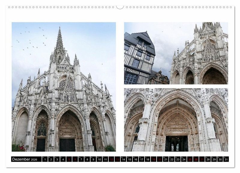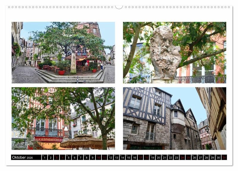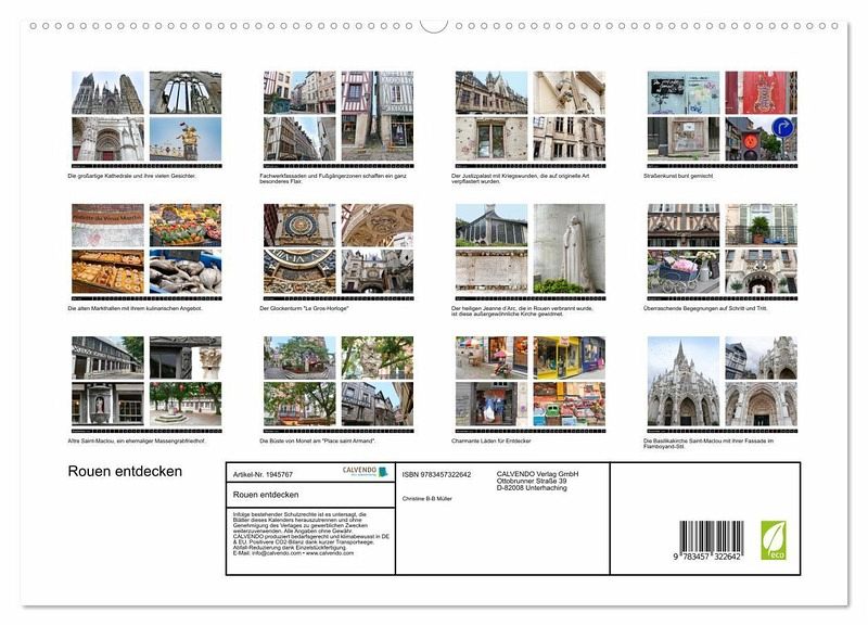 Ein Kalender reicht nicht aus, um die vielen Seiten von Rouen, der Hauptstadt der Normandie, zu zeigen. Um dennoch eine Vorstellung davon zu bekommen, warum Sie diese Stadt unbedingt besuchen sollten, befinden sich auf jedem Kalenderblatt drei bis vier Ansichten der populärsten Besichtigungsziele. Darüber hinaus sind aber auch witzige Details, charmante Ecken und kleine Hingucker erfasst, die zum Flair der Stadt beitragen und sie so liebenswert machen.