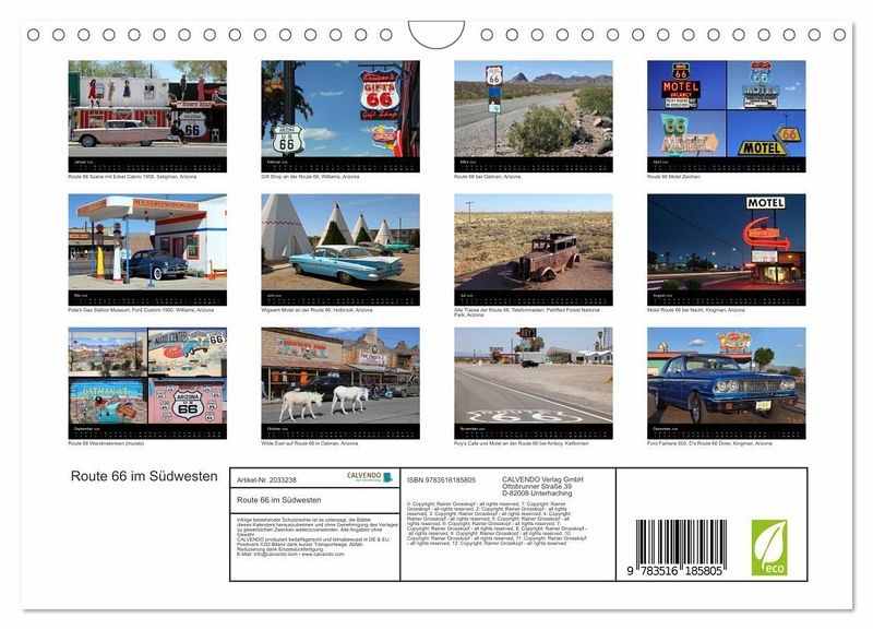 QUALITÄT - Hochwertiger Fotokalender mit 12 wunderschönen Motiven auf lichtbeständigem Bilderdruckpapier, robuste Spiralbindung mit Aufhängebügel.NACHHALTIG - deutliche Abfallreduzierung durch bedarfsgerechte Einzelstückfertigung, umweltfreundliches FSC-zertifiziertes Papier, Produktion in Deutschland, klimabewusste Logistik.PERFEKTES GESCHENK - Kalender für Freunde und Familie, für Kinder und Erwachsene, jung und alt, zu Weihnachten, Geburtstag oder zwischendurch.VIELFALT - Bildkalender in verschiedenen Formaten, z.B. DIN A5, DIN A4, DIN A3 sowie DIN A2. Ob Naturmotiv, Gemälde oder Fotos, ideal für ein persönliches Wohlfühlambiente.Die Route 66, auch Mother Road genannt, genießt Kultstatus bei den meisten USA Reisenden. Der Kalender zeigt das wohl schönste Teilstück der Route 66 im Südwesten der USA. von Autor(in): gro