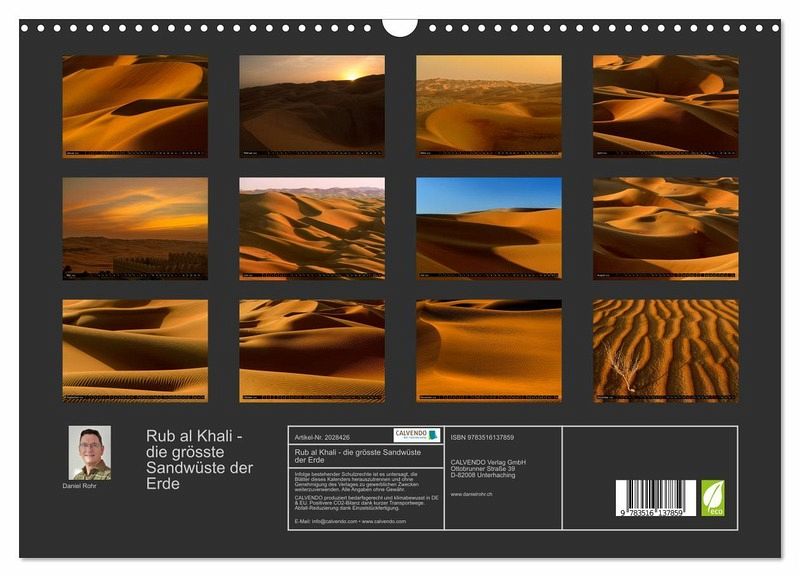 QUALITÄT - Hochwertiger Fotokalender mit 12 wunderschönen Motiven auf lichtbeständigem Bilderdruckpapier, robuste Spiralbindung mit Aufhängebügel.NACHHALTIG - deutliche Abfallreduzierung durch bedarfsgerechte Einzelstückfertigung, umweltfreundliches FSC-zertifiziertes Papier, Produktion in Deutschland, klimabewusste Logistik.PERFEKTES GESCHENK - Kalender für Freunde und Familie, für Kinder und Erwachsene, jung und alt, zu Weihnachten, Geburtstag oder zwischendurch.VIELFALT - Bildkalender in verschiedenen Formaten, z.B. DIN A5, DIN A4, DIN A3 sowie DIN A2. Ob Naturmotiv, Gemälde oder Fotos, ideal für ein persönliches Wohlfühlambiente.Eine Reise durch die grösste Sandwüste der Erde (V.A.E.) von Autor(in): Daniel Rohr