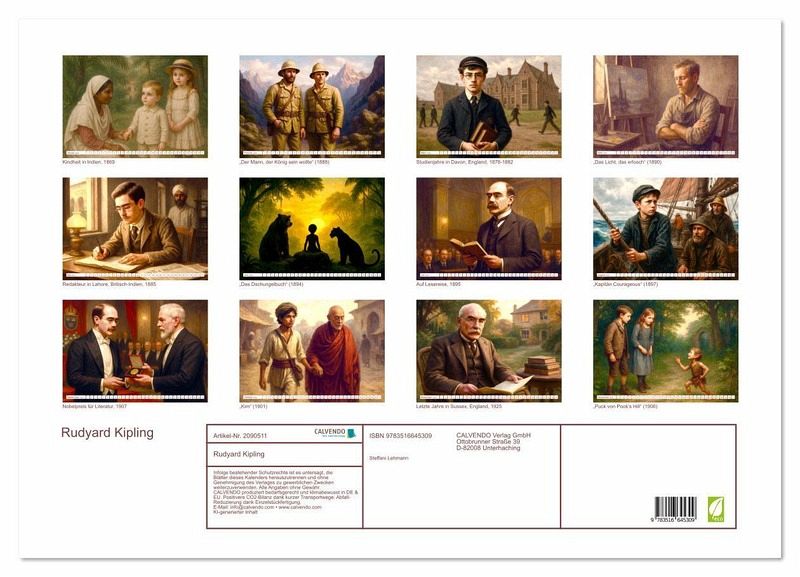 Dieser Literaturkalender präsentiert Szenen aus Rudyard Kiplings berühmtesten Werken, wie "Das Dschungelbuch", und biografische Stationen seines außergewöhnlichen Lebens zwischen Indien und England. Die stimmungsvollen Bilder im Stil klassischer Ölmalerei hat Steffani Lehmann mit Unterstützung einer KI editiert.