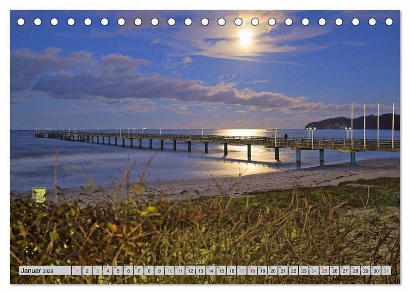 November: Der feine Sandstrand in Binz bei Sonnenuntergang von der Seebrücke aus gesehen