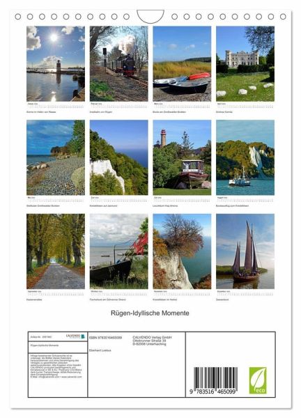 Rügen ist die größte deutsche Insel und als Urlaubsparadies sehr beliebt. Sie ist über eine neu erbaute Brücke oder den alten Rügen-damm zu erreichen. Die Insel bietet eine Vielzahl von Sehenswürdigkeiten, wie Strände, Steilküsten, Bodden, uralte Wälder und Alleen. Dieser Kalender zeigt einige der Schönheiten dieser Insel.
