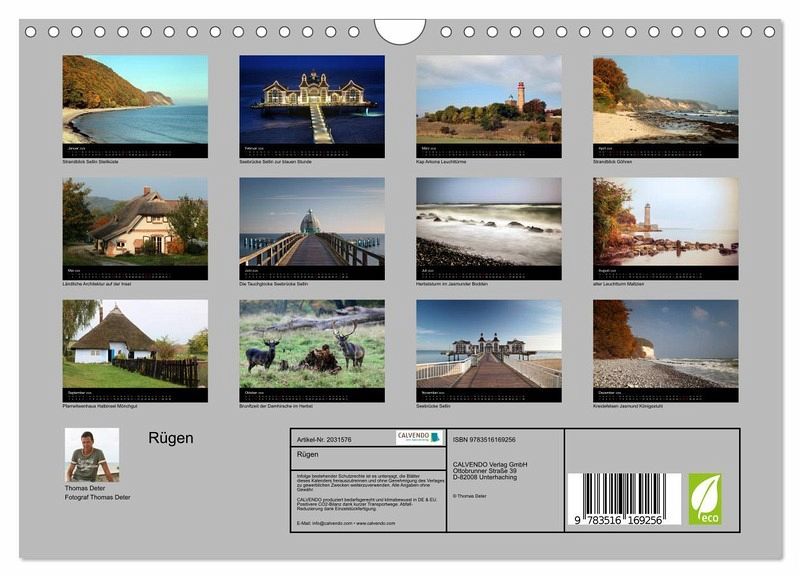 Rügen ist die größte deutsche Insel. Sie ist beliebtes Reiseziel mit all den Sehenswürdigkeiten, der einzigartigen Natur und der lebendigen Tierwelt. Ein paar Impressionen zeigt dieser Kalender vom Fotografen Thomas Deter.