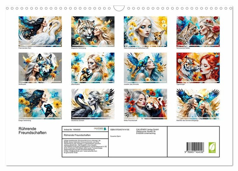 QUALITÄT - Hochwertiger Fotokalender mit 12 wunderschönen Motiven auf lichtbeständigem Bilderdruckpapier, robuste Spiralbindung mit Aufhängebügel.NACHHALTIG - deutliche Abfallreduzierung durch bedarfsgerechte Einzelstückfertigung, umweltfreundliches FSC-zertifiziertes Papier, Produktion in Deutschland, klimabewusste Logistik.PERFEKTES GESCHENK - Kalender für Freunde und Familie, für Kinder und Erwachsene, jung und alt, zu Weihnachten, Geburtstag oder zwischendurch.VIELFALT - Bildkalender in verschiedenen Formaten, z.B. DIN A5, DIN A4, DIN A3 sowie DIN A2. Ob Naturmotiv, Gemälde oder Fotos, ideal für ein persönliches Wohlfühlambiente.Magische Verbindung von Tieren und Ladys, mit KI erstellt. von Autor(in): Dusanka Djeric