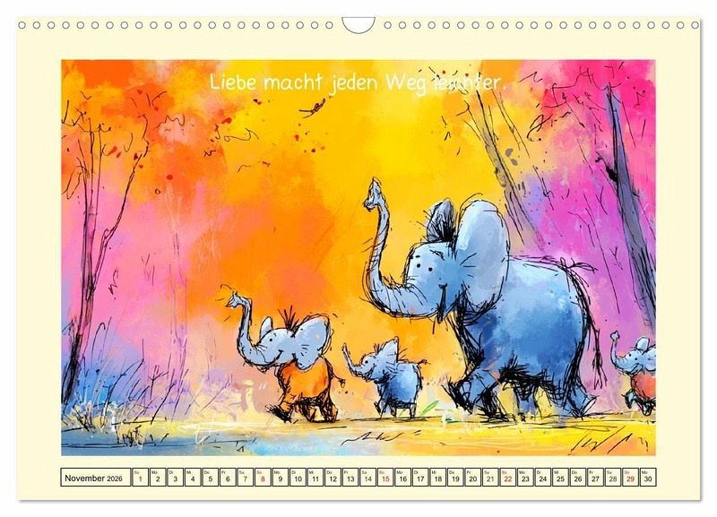 "Rüssel und Herz" lädt dich ein in eine weiche, farbenfrohe Welt kleiner Elefanten, die mit neugierigen Augen und großen Herzen durch ihre natürliche Umgebung tapsen. Die liebevollen Cartoons zeigen Momente voller Freundschaft, Stille, Staunen und sanfter Lebensfreude. Jedes Bild wurde mit der Hilfe von KI erstellt und enthält eine kleine Weisheit, die zum Schmunzeln einlädt und zugleich daran erinnert, das Leben mit mehr Milde zu betrachten. Dieser Kalender ist ein bezaubernder und sanfter Begleiter durchs Jahr.