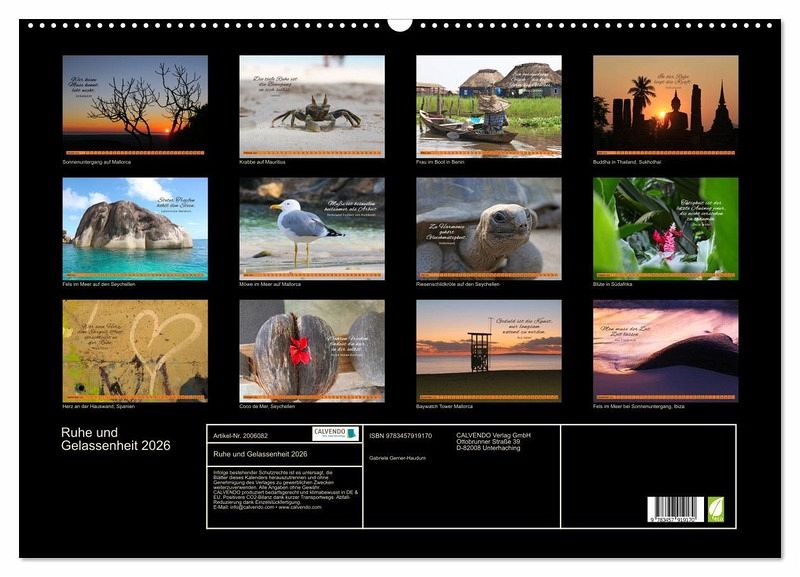 Die Bilder für diesen Kalender sind auf mehreren Reisen der Reisefotografin Gabriele Gerner-Haudum, die schon um die ganze Welt gereist ist, entstanden. Sorgfältig zusammengestellte Motive zu einem ihrer Lieblingsthemen "Ruhe, Entspannung, keine Eile" hat die Autorin mehrerer Geschenkbücher, Bildbände (unter anderem für National Geographic) und vieler Kalender mit passenden Zitaten und Weisheiten aus aller Welt kombiniert. Genießen Sie ein Jahr Entschleunigung mit diesem herrlichen Kalender.