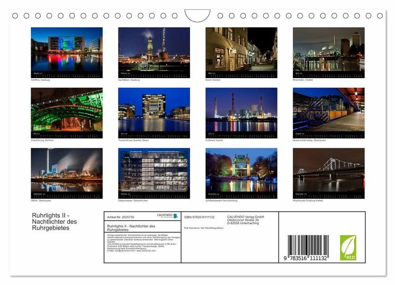 QUALITÄT - Hochwertiger Fotokalender mit 12 wunderschönen Motiven auf lichtbeständigem Bilderdruckpapier, robuste Spiralbindung mit Aufhängebügel.NACHHALTIG - deutliche Abfallreduzierung durch bedarfsgerechte Einzelstückfertigung, umweltfreundliches FSC-zertifiziertes Papier, Produktion in Deutschland, klimabewusste Logistik.PERFEKTES GESCHENK - Kalender für Freunde und Familie, für Kinder und Erwachsene, jung und alt, zu Weihnachten, Geburtstag oder zwischendurch.VIELFALT - Bildkalender in verschiedenen Formaten, z.B. DIN A5, DIN A4, DIN A3 sowie DIN A2. Ob Naturmotiv, Gemälde oder Fotos, ideal für ein persönliches Wohlfühlambiente.Nachtfotos aus dem Ruhrgebiet von Autor(in): Rolf Heymanns