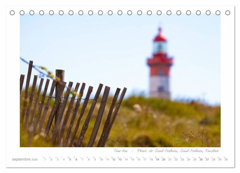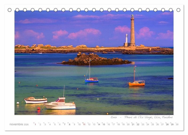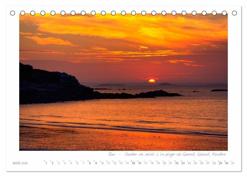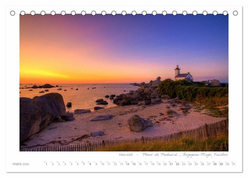 Digemer mad - on vous souhaite la bienvenue dans le Finistère, le département français le plus à l'ouest de la Bretagne. Vous cherchez une raison d'y aller? Les paysages littoraux dans toutes leurs diversités: les plages de sable fin, les rochers sauvages, une invitation à la baignade et à la promenade. Pour les amateurs de phares, il y en a 40 en Bretagne! Le calendrier montre cette région merveilleuse avec ses côtes et ses phares - de Saint Mathieu à l'ouest au Guerzit et Plougasnou sur la Manche.