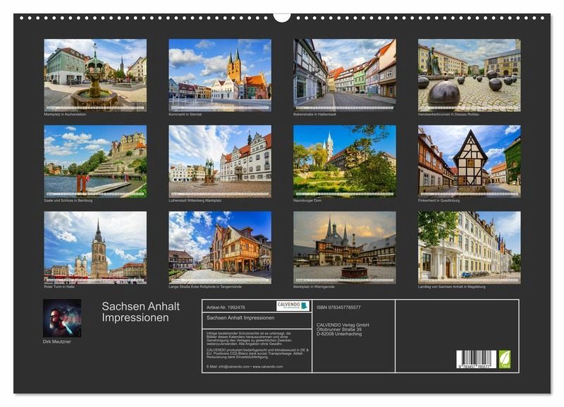 Dieser wunderschöne Kalender von Sachsen-Anhalt, führt Sie durch einige der schönsten Städte dieses Bundeslandes. Monat für Monat werden Sie begeistert von diesen einmaligen Bildern sein, die der Fotograf Dirk Meutzner für Sie herausgesucht hat. Sachsen-Anhalt ist eine parlamentarische Republik und als Land ein teilsouveräner Gliedstaat der Bundesrepublik Deutschland. Das Flächenland hat etwa 2,21 Millionen Einwohner. Die beiden größten Städte des Landes sind die Landeshauptstadt Magdeburg und Halle (Saale), ein weiteres Oberzentrum ist Dessau-Roßlau.
