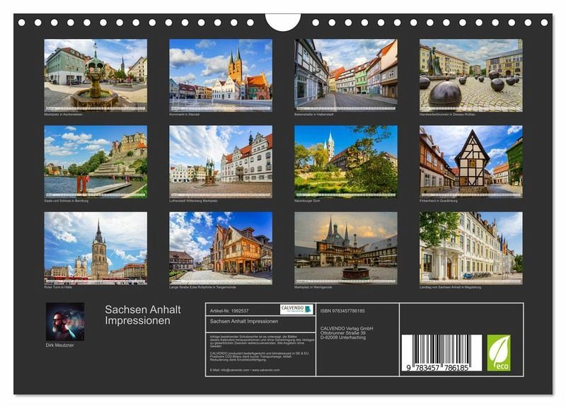 Dieser wunderschöne Kalender von Sachsen-Anhalt, führt Sie durch einige der schönsten Städte dieses Bundeslandes. Monat für Monat werden Sie begeistert von diesen einmaligen Bildern sein, die der Fotograf Dirk Meutzner für Sie herausgesucht hat. Sachsen-Anhalt ist eine parlamentarische Republik und als Land ein teilsouveräner Gliedstaat der Bundesrepublik Deutschland. Das Flächenland hat etwa 2,21 Millionen Einwohner. Die beiden größten Städte des Landes sind die Landeshauptstadt Magdeburg und Halle (Saale), ein weiteres Oberzentrum ist Dessau-Roßlau.
