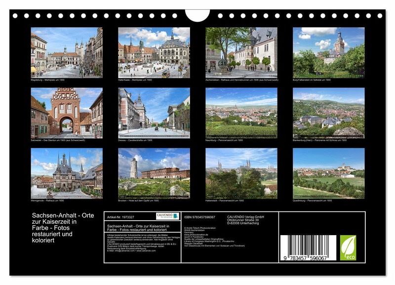 Das Gebiet des heutigen Sachsen-Anhalt hat eine interessante Geschichte und Landschaft und war auch in den Jahren 1895 bis 1910 bunt und voller Leben. In diesem besonderen Kalender sehen Sie alte Photochromdrucke und Schwarzweißfotos, die möglichst detailreich farblich restauriert und koloriert wurden, um den Orten, den Menschen und dem damaligen Alltag zur Kaiserzeit nicht nur Farbe, sondern auch neues Leben einzuhauchen. Kommen Sie mit auf eine Bilderreise durch das alte Sachsen-Anhalt in der Zeit um 1900, sehen Sie bekannte Orte, Landschaften, Plätze und Straßen und haben Sie teil am Leben und Umfeld der Menschen dieser Zeit, auch wenn es in diesem Kalender nur eine kleine Auswahl an Örtlichkeiten ist.