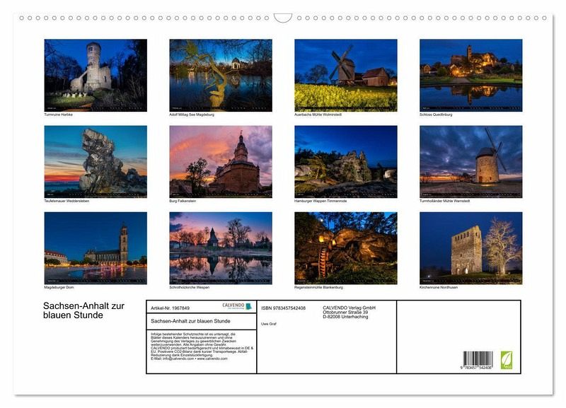 QUALITÄT - Hochwertiger Fotokalender mit 12 wunderschönen Motiven auf lichtbeständigem Bilderdruckpapier, robuste Spiralbindung mit Aufhängebügel.NACHHALTIG - deutliche Abfallreduzierung durch bedarfsgerechte Einzelstückfertigung, umweltfreundliches FSC-zertifiziertes Papier, Produktion in Deutschland, klimabewusste Logistik.PERFEKTES GESCHENK - Kalender für Freunde und Familie, für Kinder und Erwachsene, jung und alt, zu Weihnachten, Geburtstag oder zwischendurch.VIELFALT - Bildkalender in verschiedenen Formaten, z.B. DIN A5, DIN A4, DIN A3 sowie DIN A2. Ob Naturmotiv, Gemälde oder Fotos, ideal für ein persönliches Wohlfühlambiente.Es ist immer wieder faszinierend unser Bundesland Sachsen-Anhalt zur blauen Stunde zu erleben. von Autor(in): Uwe Graf