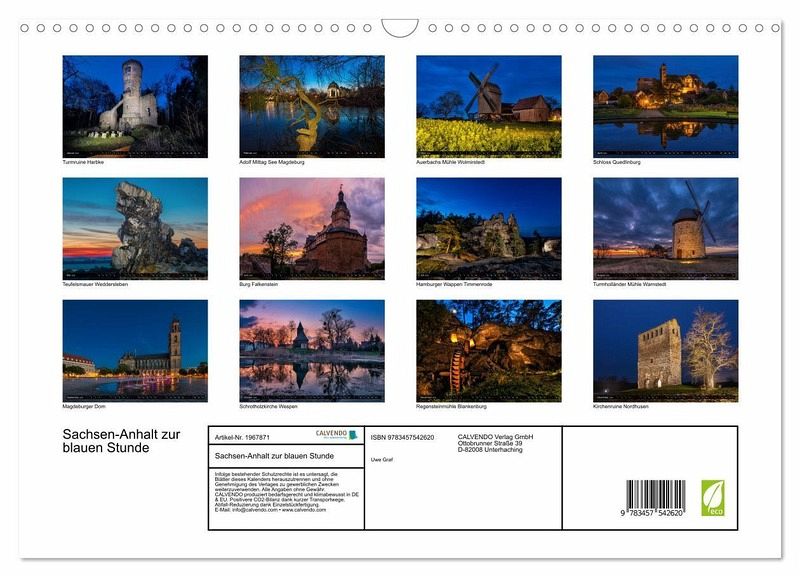QUALITÄT - Hochwertiger Fotokalender mit 12 wunderschönen Motiven auf lichtbeständigem Bilderdruckpapier, robuste Spiralbindung mit Aufhängebügel.NACHHALTIG - deutliche Abfallreduzierung durch bedarfsgerechte Einzelstückfertigung, umweltfreundliches FSC-zertifiziertes Papier, Produktion in Deutschland, klimabewusste Logistik.PERFEKTES GESCHENK - Kalender für Freunde und Familie, für Kinder und Erwachsene, jung und alt, zu Weihnachten, Geburtstag oder zwischendurch.VIELFALT - Bildkalender in verschiedenen Formaten, z.B. DIN A5, DIN A4, DIN A3 sowie DIN A2. Ob Naturmotiv, Gemälde oder Fotos, ideal für ein persönliches Wohlfühlambiente.Es ist immer wieder faszinierend unser Bundesland Sachsen-Anhalt zur blauen Stunde zu erleben. von Autor(in): Uwe Graf