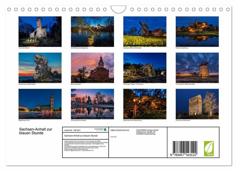QUALITÄT - Hochwertiger Fotokalender mit 12 wunderschönen Motiven auf lichtbeständigem Bilderdruckpapier, robuste Spiralbindung mit Aufhängebügel.NACHHALTIG - deutliche Abfallreduzierung durch bedarfsgerechte Einzelstückfertigung, umweltfreundliches FSC-zertifiziertes Papier, Produktion in Deutschland, klimabewusste Logistik.PERFEKTES GESCHENK - Kalender für Freunde und Familie, für Kinder und Erwachsene, jung und alt, zu Weihnachten, Geburtstag oder zwischendurch.VIELFALT - Bildkalender in verschiedenen Formaten, z.B. DIN A5, DIN A4, DIN A3 sowie DIN A2. Ob Naturmotiv, Gemälde oder Fotos, ideal für ein persönliches Wohlfühlambiente.Es ist immer wieder faszinierend unser Bundesland Sachsen-Anhalt zur blauen Stunde zu erleben. von Autor(in): Uwe Graf
