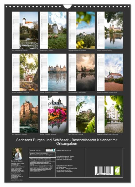 Der Kalender von Benjamin Bisanz enthält wunderschöne Bilder von beeindruckenden Schlössern und Burgen in Sachsen. Jeder Monat bietet einen Blick auf eine andere Burg oder ein anderes Schloss und enthält Ortsangaben, um den Betrachter in die Region zu führen. Lassen Sie sich von der majestätischen Schönheit dieser historischen Gebäude faszinieren, während Sie das Jahr 2023 verbringen.