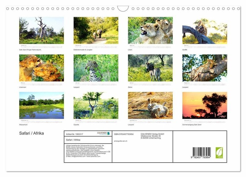 QUALITÄT - Hochwertiger Fotokalender mit 12 wunderschönen Motiven auf lichtbeständigem Bilderdruckpapier, robuste Spiralbindung mit Aufhängebügel.NACHHALTIG - deutliche Abfallreduzierung durch bedarfsgerechte Einzelstückfertigung, umweltfreundliches FSC-zertifiziertes Papier, Produktion in Deutschland, klimabewusste Logistik.PERFEKTES GESCHENK - Kalender für Freunde und Familie, für Kinder und Erwachsene, jung und alt, zu Weihnachten, Geburtstag oder zwischendurch.VIELFALT - Bildkalender in verschiedenen Formaten, z.B. DIN A5, DIN A4, DIN A3 sowie DIN A2. Ob Naturmotiv, Gemälde oder Fotos, ideal für ein persönliches Wohlfühlambiente.Traumhafte Safari-Reise in Sabi Sand "Big 5" hautnahe erleben von Autor(in): photografie-iam.ch