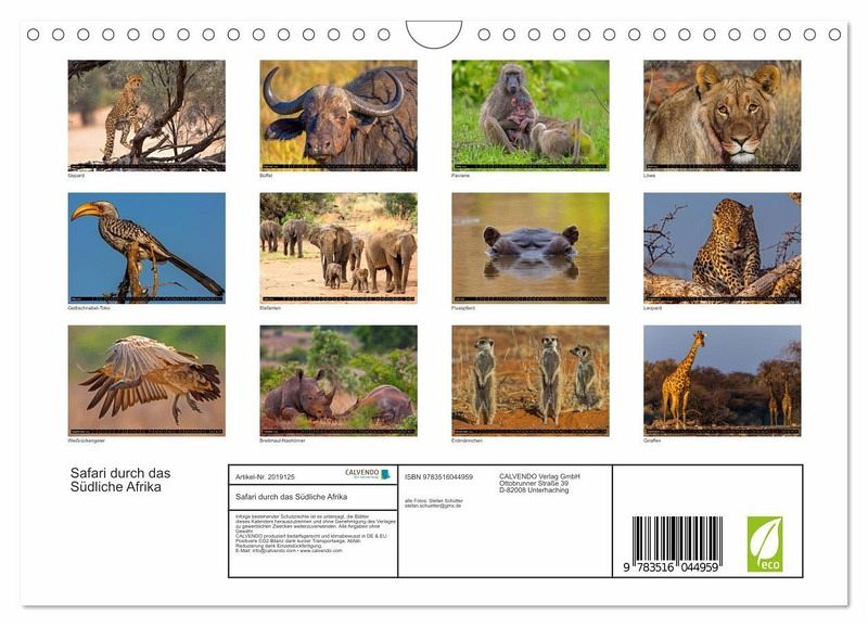 QUALITÄT - Hochwertiger Fotokalender mit 12 wunderschönen Motiven auf lichtbeständigem Bilderdruckpapier, robuste Spiralbindung mit Aufhängebügel.NACHHALTIG - deutliche Abfallreduzierung durch bedarfsgerechte Einzelstückfertigung, umweltfreundliches FSC-zertifiziertes Papier, Produktion in Deutschland, klimabewusste Logistik.PERFEKTES GESCHENK - Kalender für Freunde und Familie, für Kinder und Erwachsene, jung und alt, zu Weihnachten, Geburtstag oder zwischendurch.VIELFALT - Bildkalender in verschiedenen Formaten, z.B. DIN A5, DIN A4, DIN A3 sowie DIN A2. Ob Naturmotiv, Gemälde oder Fotos, ideal für ein persönliches Wohlfühlambiente.Ein Streifzug durch die Nationalparks des Südlichen Afrika von Autor(in): Stefan Schütter