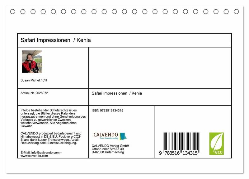 QUALITÄT - Hochwertiger Fotokalender mit 12 wunderschönen Motiven auf lichtbeständigem Bilderdruckpapier, robuste Spiralbindung.NACHHALTIG - deutliche Abfallreduzierung durch bedarfsgerechte Einzelstückfertigung, umweltfreundliches FSC-zertifiziertes Papier, Produktion in Deutschland, klimabewusste Logistik.PERFEKTES GESCHENK - Kalender für Freunde und Familie, für Kinder und Erwachsene, jung und alt, zu Weihnachten, Geburtstag oder zwischendurch.VIELFALT - Bildkalender in verschiedenen Formaten, z.B. DIN A5, DIN A4, DIN A3 sowie DIN A2. Ob Naturmotiv, Gemälde oder Fotos, ideal für ein persönliches Wohlfühlambiente.Safari Eindrücke aus Kenia: Wildlife pur von Autor(in): Susan Michel