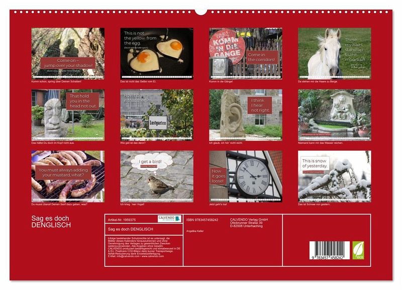 PREMIUM-LINIE - Brillanter Fotokalender mit 12 wunderschönen Motiven, Kunstdruck in Hochglanz in Museumsqualität.QUALITÄT - edle Materialien, stabile Rückwand mit 2 innovativen Einstecktaschen für eine optimale Präsentation an der Wand.NACHHALTIG - deutliche Abfallreduzierung durch bedarfsgerechte Einzelstückfertigung, umweltfreundliches FSC-zertifiziertes Papier, Produktion in Deutschland, klimabewusste Logistik.PERFEKTES GESCHENK - Kalender für Freunde und Familie, für Kinder und Erwachsene, jung und alt, zu Weihnachten, Geburtstag oder zwischendurch.Deutsche Redewendungen 1 : 1 ins Englische übersetzt ... von Autor(in): Angelika Keller