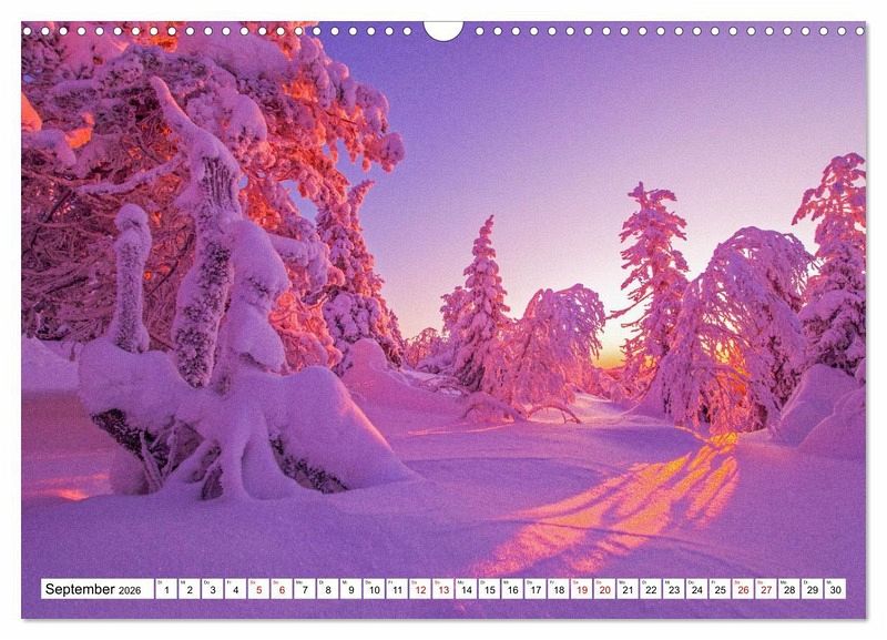 Januar: Sonnenaufgang im tief verschneiten Wald, Finnisch Lappland