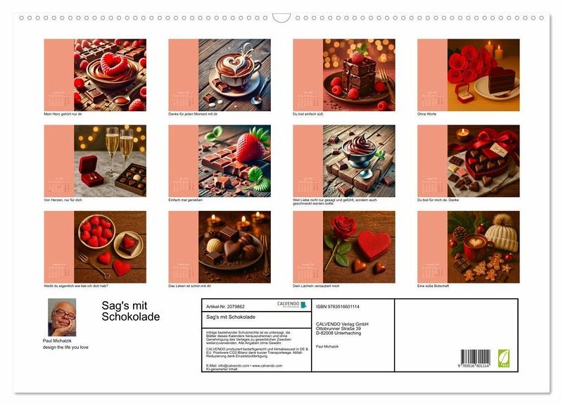 QUALITÄT - Hochwertiger Fotokalender mit 12 wunderschönen Motiven auf lichtbeständigem Bilderdruckpapier, robuste Spiralbindung mit Aufhängebügel.NACHHALTIG - deutliche Abfallreduzierung durch bedarfsgerechte Einzelstückfertigung, umweltfreundliches FSC-zertifiziertes Papier, Produktion in Deutschland, klimabewusste Logistik.PERFEKTES GESCHENK - Kalender für Freunde und Familie, für Kinder und Erwachsene, jung und alt, zu Weihnachten, Geburtstag oder zwischendurch.VIELFALT - Bildkalender in verschiedenen Formaten, z.B. DIN A5, DIN A4, DIN A3 sowie DIN A2. Ob Naturmotiv, Gemälde oder Fotos, ideal für ein persönliches Wohlfühlambiente.Ein Kalender als Liebeserklärung der besonderen Art. Weil Liebe nicht nur gesagt, sondern auch gefühlt und geschmeckt werden sollte. von Autor(in): Paul Michalzik