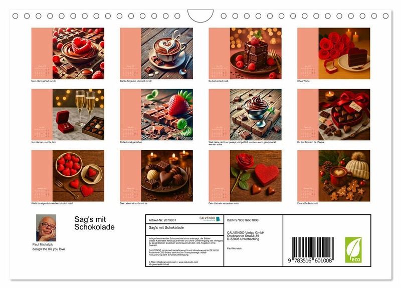 QUALITÄT - Hochwertiger Fotokalender mit 12 wunderschönen Motiven auf lichtbeständigem Bilderdruckpapier, robuste Spiralbindung mit Aufhängebügel.NACHHALTIG - deutliche Abfallreduzierung durch bedarfsgerechte Einzelstückfertigung, umweltfreundliches FSC-zertifiziertes Papier, Produktion in Deutschland, klimabewusste Logistik.PERFEKTES GESCHENK - Kalender für Freunde und Familie, für Kinder und Erwachsene, jung und alt, zu Weihnachten, Geburtstag oder zwischendurch.VIELFALT - Bildkalender in verschiedenen Formaten, z.B. DIN A5, DIN A4, DIN A3 sowie DIN A2. Ob Naturmotiv, Gemälde oder Fotos, ideal für ein persönliches Wohlfühlambiente.Ein Kalender als Liebeserklärung der besonderen Art. Weil Liebe nicht nur gesagt, sondern auch gefühlt und geschmeckt werden sollte. von Autor(in): Paul Michalzik