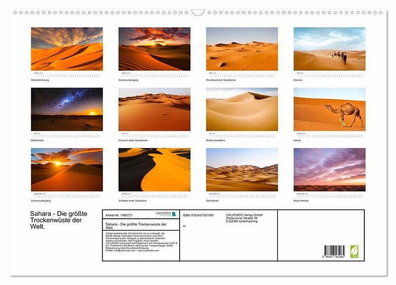 Die Sahara ist eine riesige Wüste in Afrika, die wunderschöne Landschaften zu bieten hat. Nur wenige Lebewesen können in den harten Bedingungen der Wüste überleben. Dieser Kalender zeigt 12 atemberaubende Aufnahmen der Sahara Wüste.