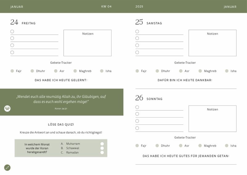 Es ist gar nicht so einfach, seinen Glauben in den Alltag zu integrieren. Zwischen Familie, Freunden und Terminen ist man manchmal überfordert. Dafür hat sich Jennah (@jennahschott) etwas überlegt: einen Jahreskalender für die muslimische Community. Der Kalender für das Jahr 2025 umfasst unter anderem Gewohnheiten, Rituale und Bräuche sowie Inspirationen für Suren, Platz für Journaling und Impulse zum religiösen Leben. Der erste Kalender in Deutschland, der sich individuell an die muslimische Community richtet!